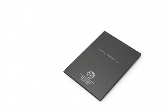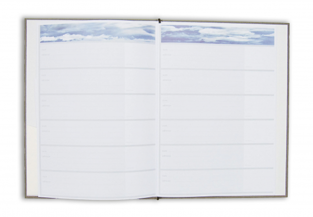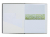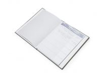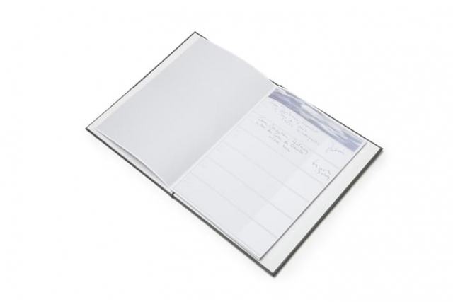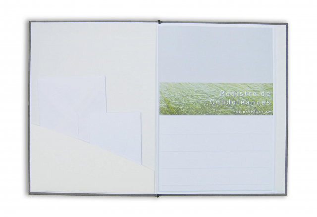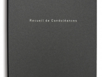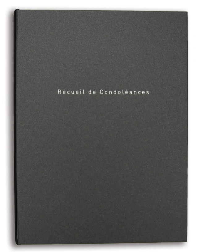 Registre de condoléances avec couverture rigide recouvert avec simili gris et pourvu d'un élastique. Fourni avec une page de garde. Feuilles à signatures à commander à part. Marquage de la raison social et logo possible à partir de 50 ex.